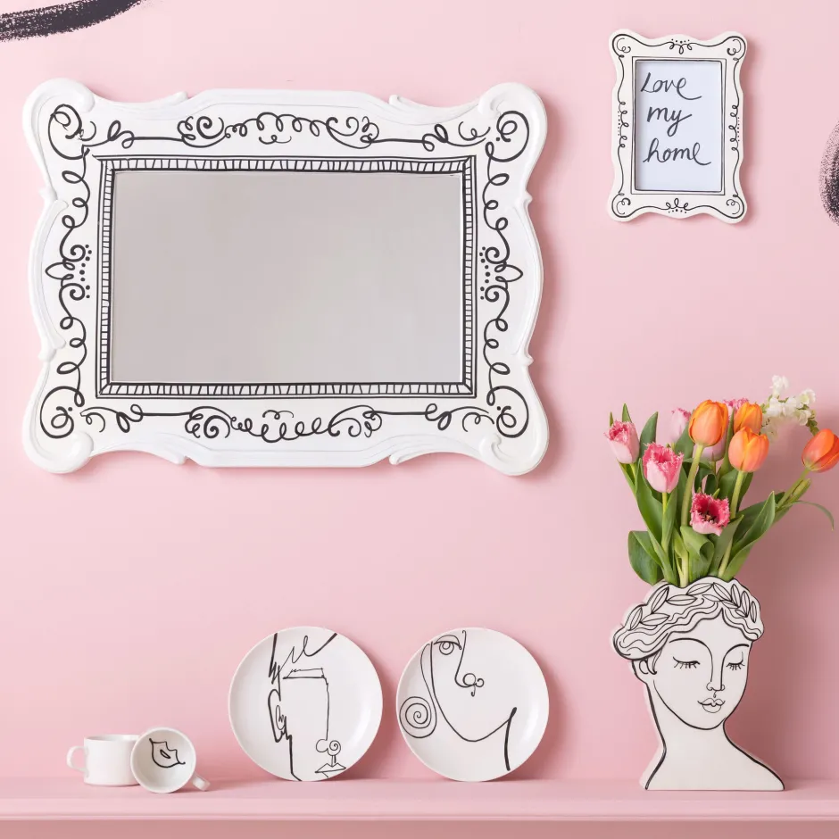 - Einzigartig machen diesen Spiegel die neo-barocke Form des Spiegel-Rahmens und die illustrativen Verzierungen in Schwarz