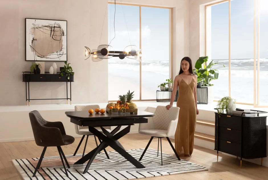 - Schwarzer Esstisch zum Ausziehen 76x120bzw.180x90cm (H/B/T) aus Metall mit Keramikplatte
