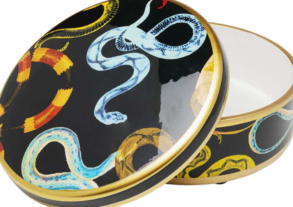- Schwarze Deko Dose aus Porzellan mit buntem Schlangen-Motiv, 9 x 19 x 19 Zentimeter (H/B/T)