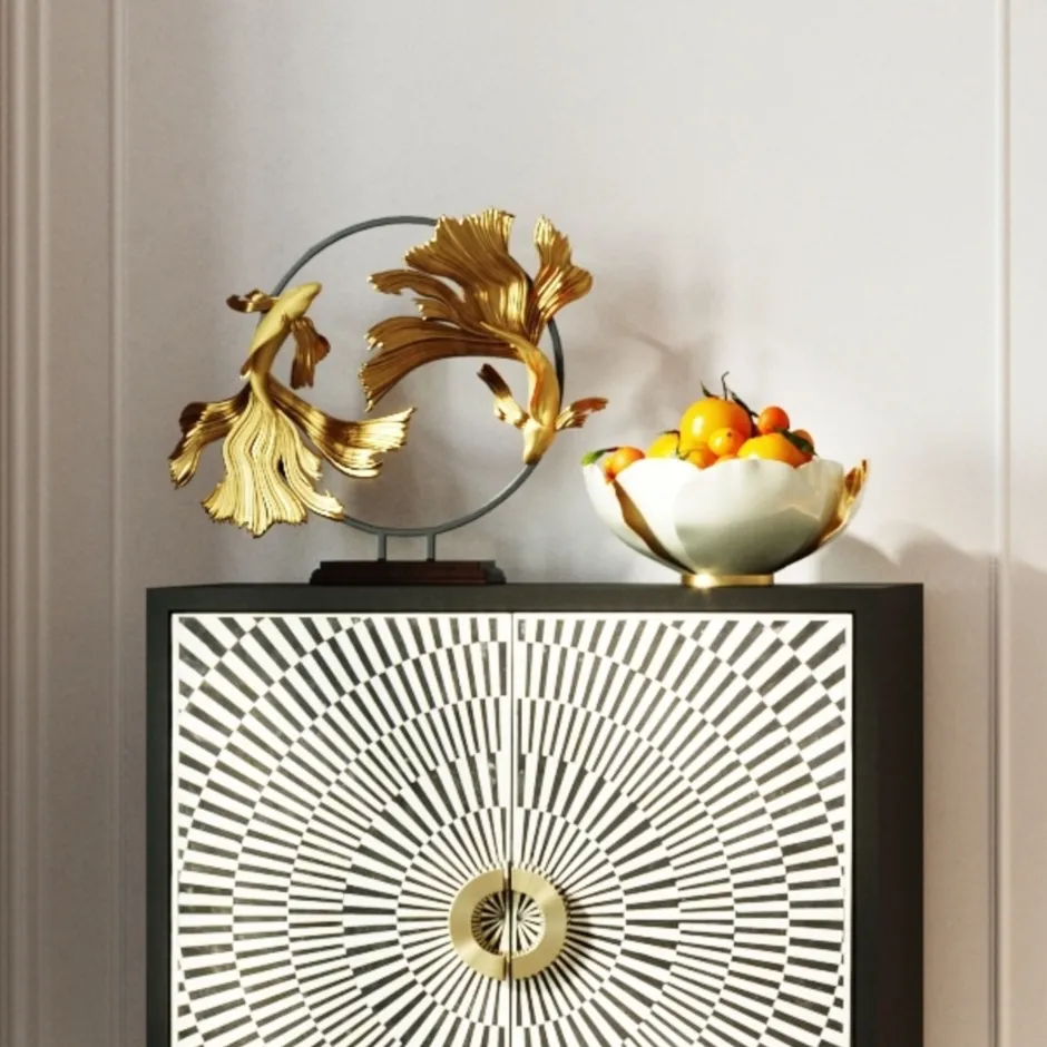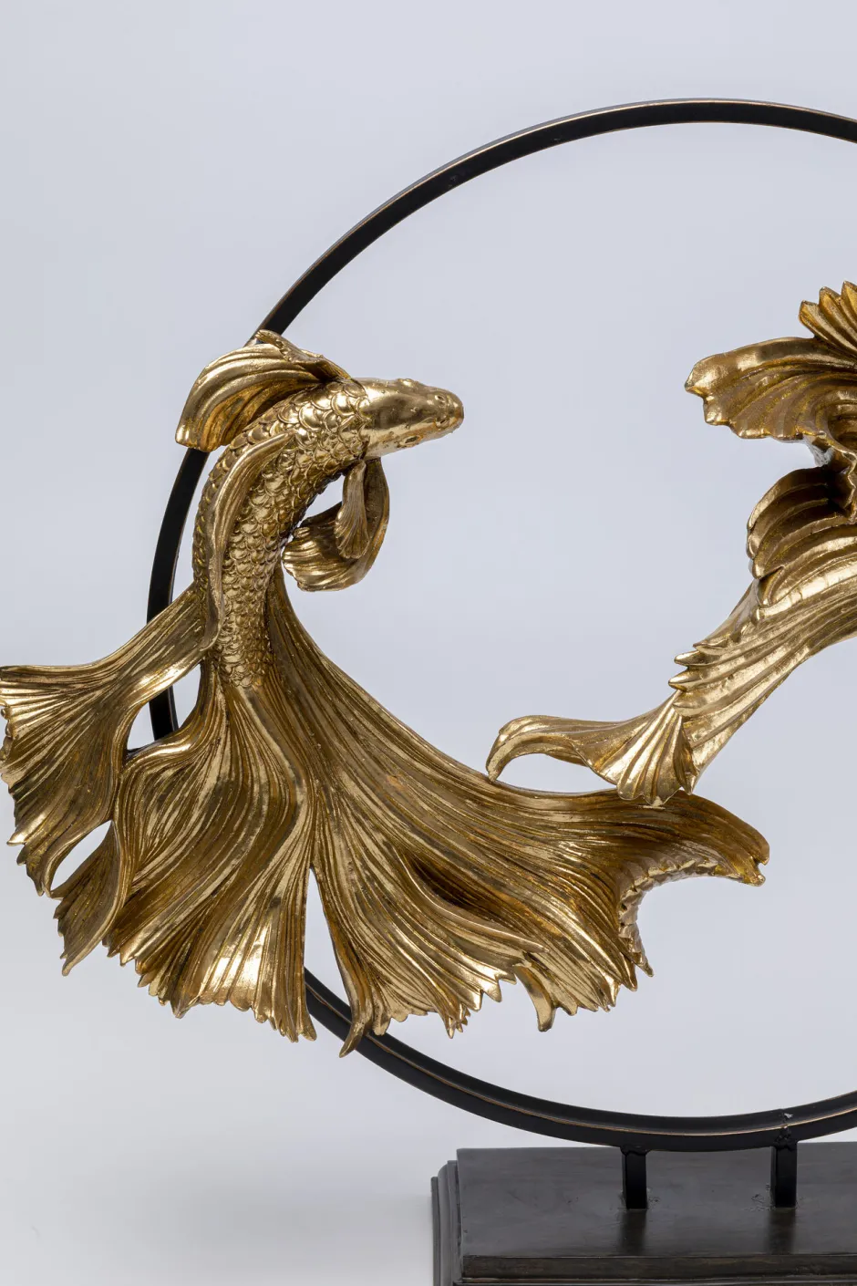 - Zwei goldfarbene Kampffische umzingeln sich, großes Deko-Objekt auf einem Sockel mit Galerie-Charakter