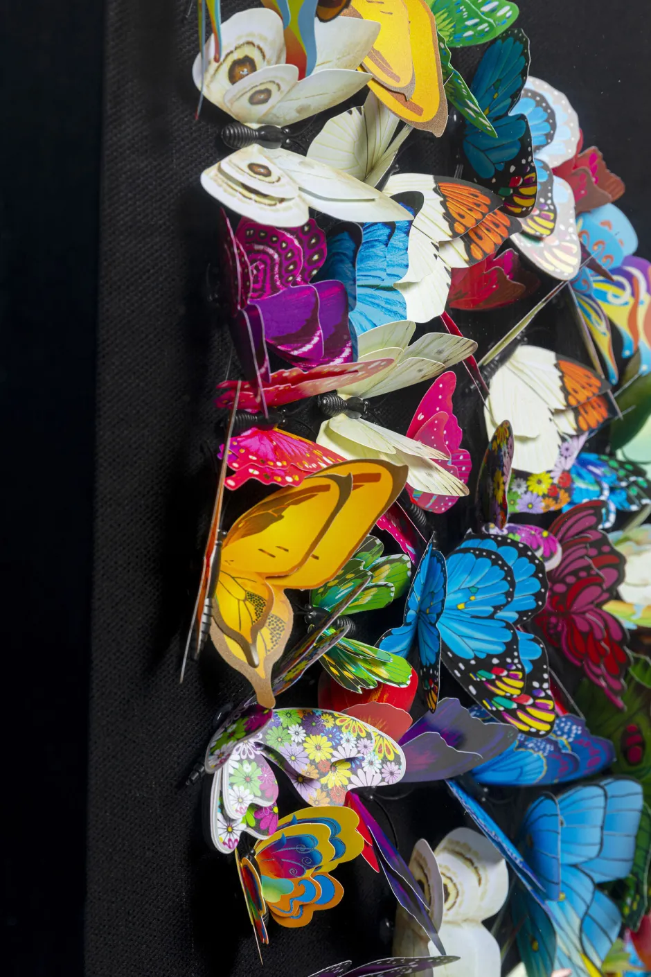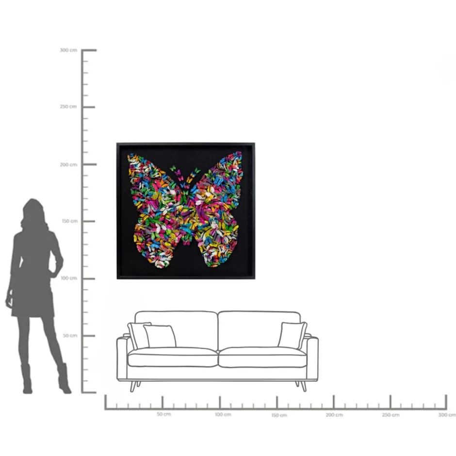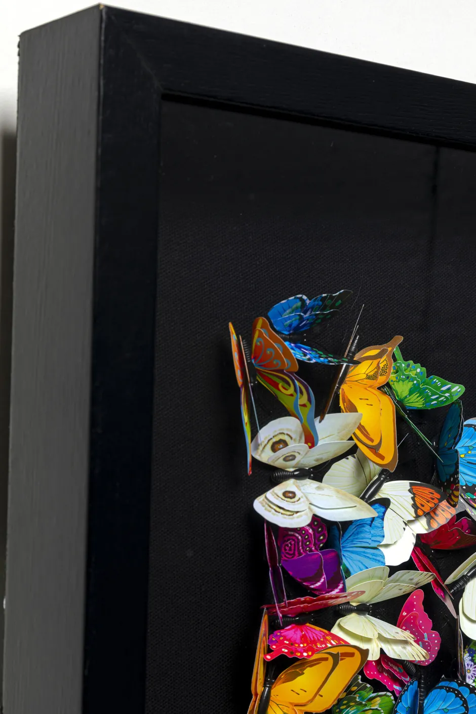 - Schwarzer Hintergrund und schwarzer Holzrahmen: Das Werk mit dreidimensionalen Papierfaltern leuchtet in Regenbogenfarben