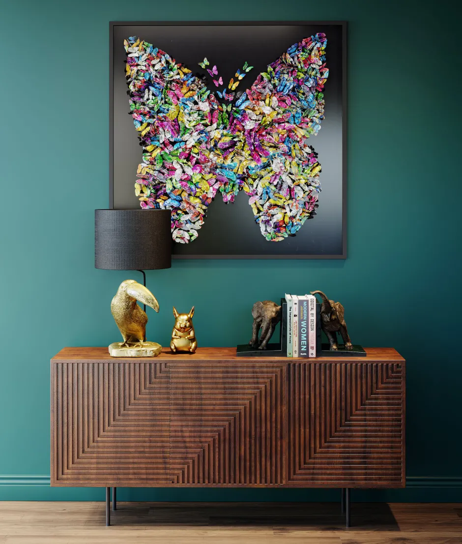- Großes, quadratisches Wandbild, das einem Schaukasten gleich unzählige kunterbunte Schmetterlinge präsentiert