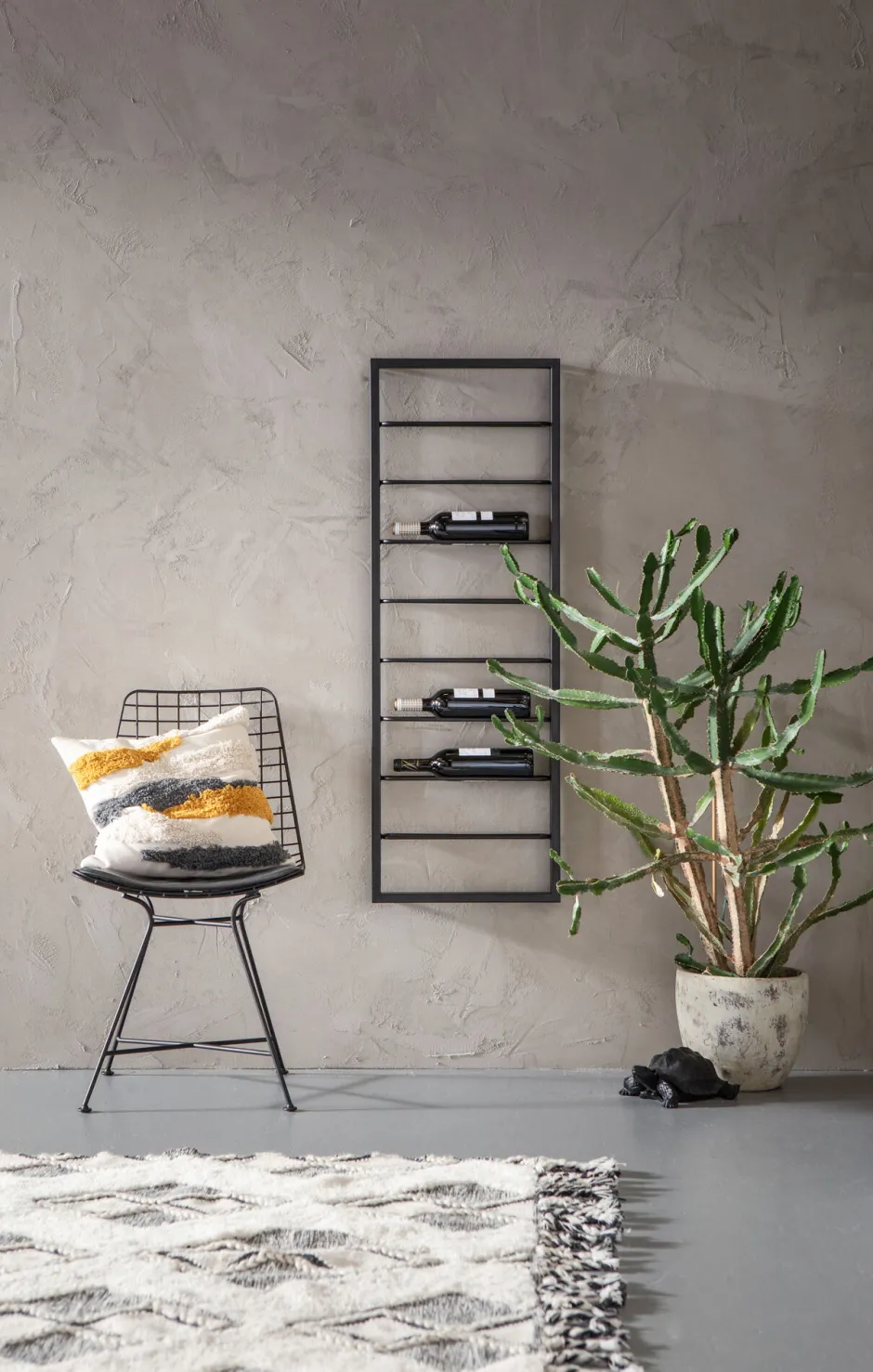 - Puristisches Weinregal in Schwarz für die Wand aus pulverbeschichtetem Stahl mit grafischen Linien