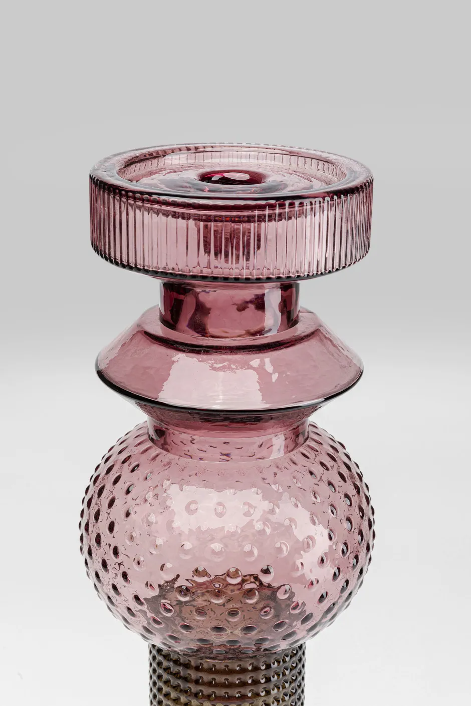 - Hoher Kerzenhalter aus unterschiedlich farbigem und geprägtem Glas in Grün-Grau und Lila-Rosé für Stumpenkerzen
