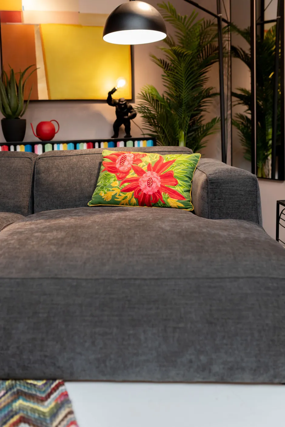 - Das Dekokissen setzt mit strahlenden Farben und floralen Motiven lebendige Akzente