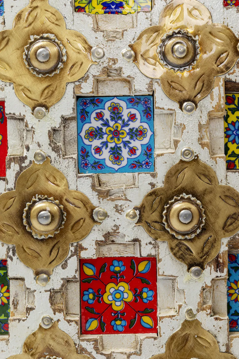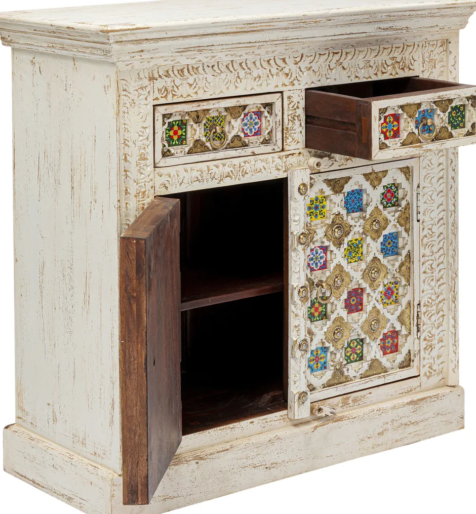 - Massivholz-Kommode mit aufwändigen Schnitzereien, messingfarbenen Metallverzierungen und bunt gemusterten Kacheln