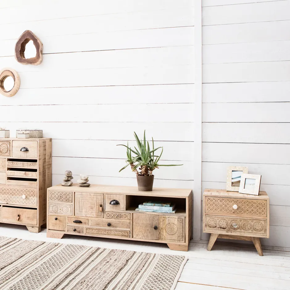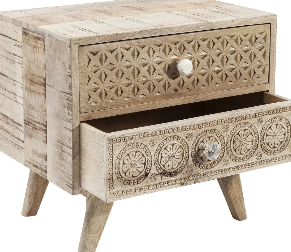 - Im Ethno-Look: handgefertigte, kleine Kommode aus Mango-Echtholz mit dekorativen Schnitzereien und zwei Schüben