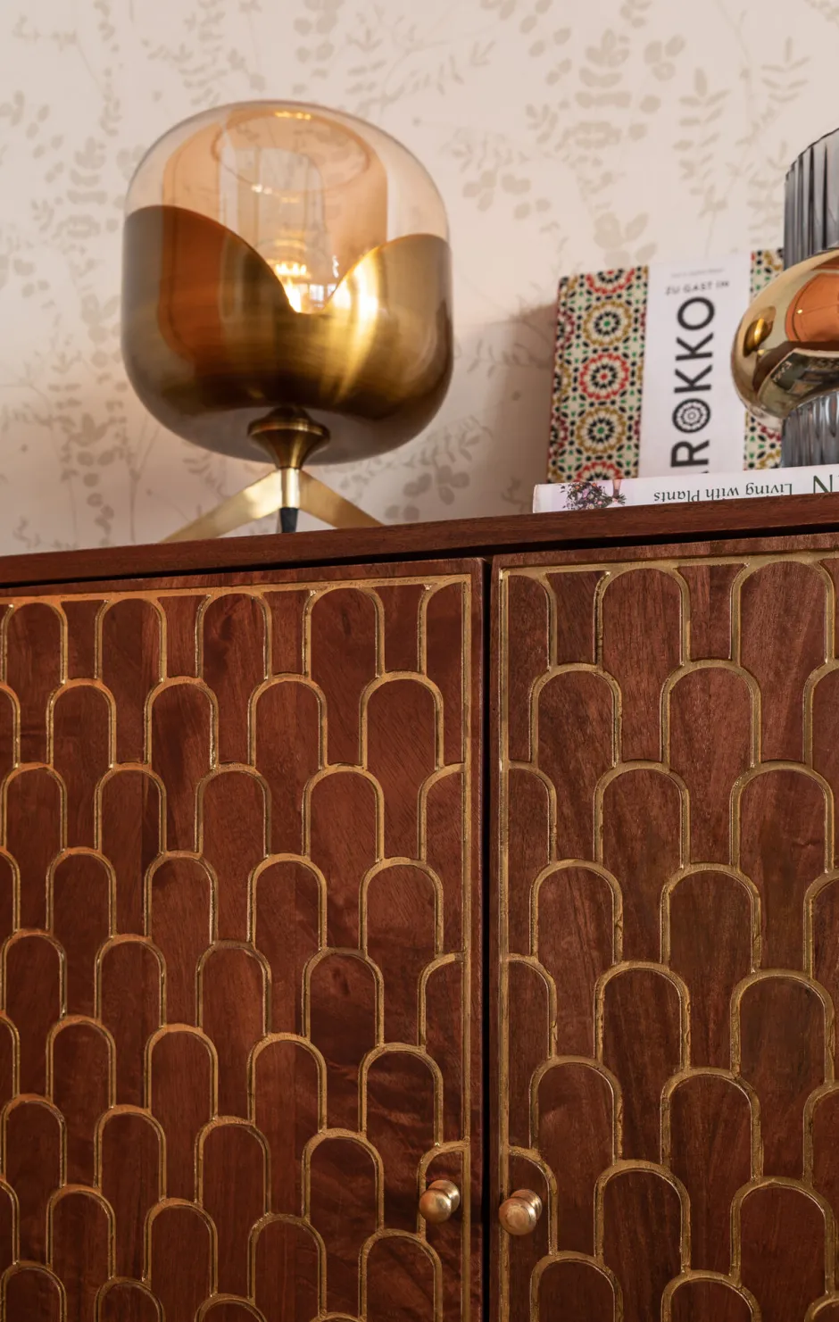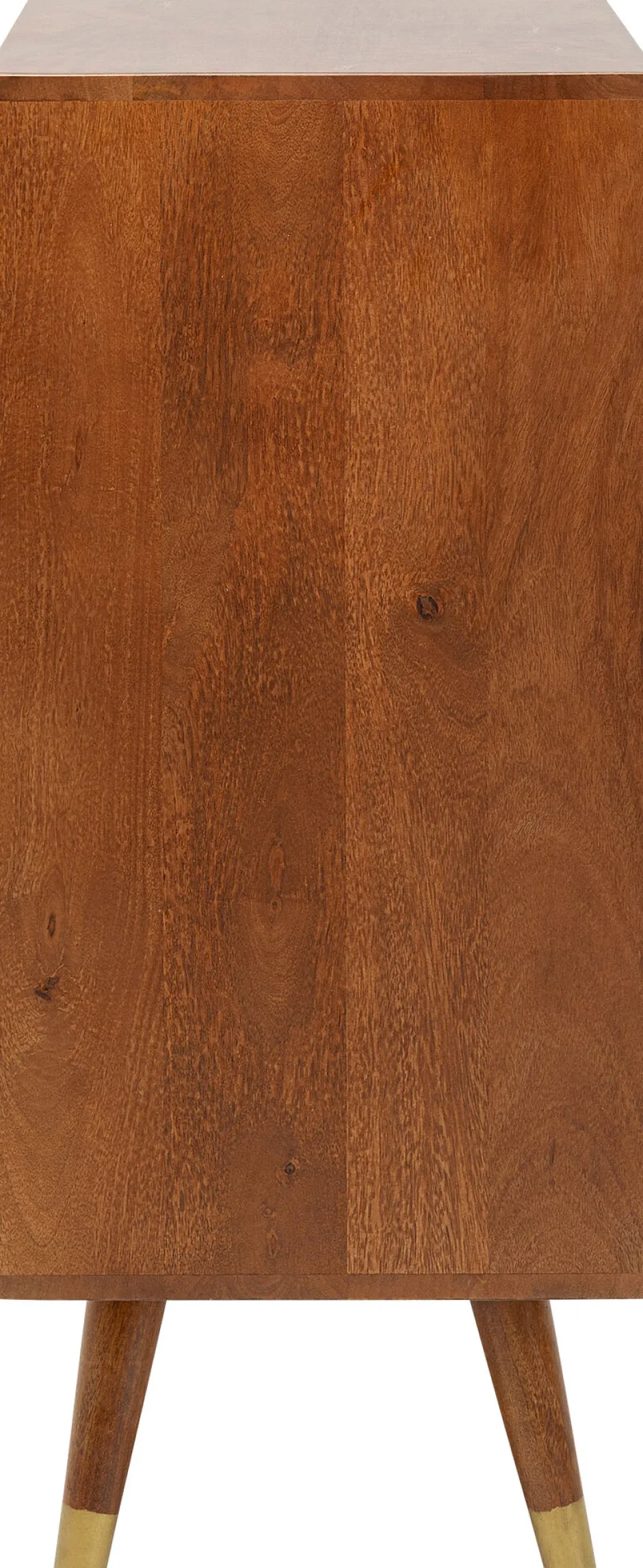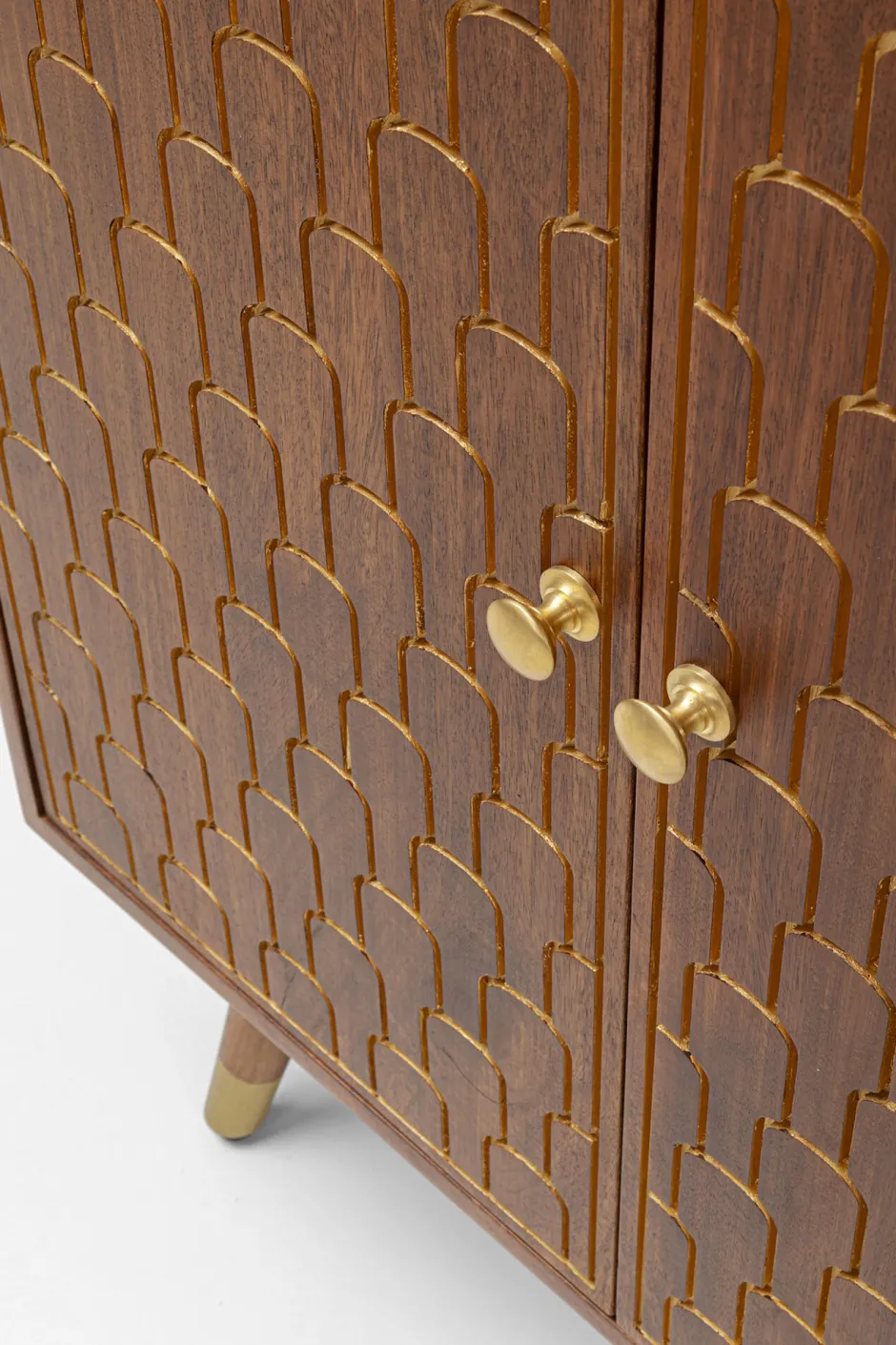 - Handgefertigte, kompakte Kommode aus Mango-Massivholz mit grafisch verzierten Fronten und handgemalten goldenen Details