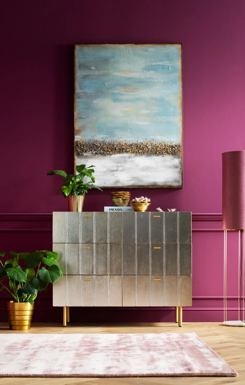 - Lackierte Schubladen-Kommode in Silber und Gold mit grafischem Frontdesign, 89 x 106 x 40 Zentimeter (H/B/T)