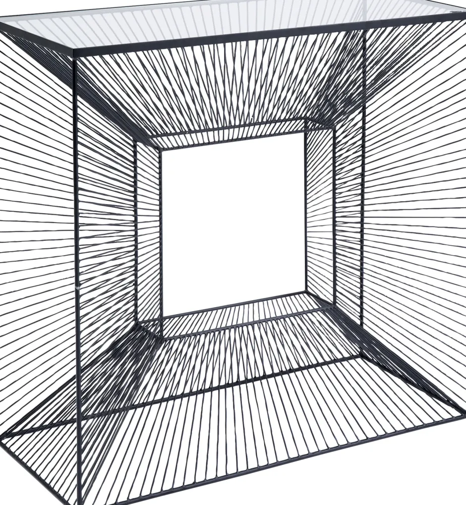 - Konsole mit Glasplatte, die durch ihr grafisches Stahldraht-Gestell wie ein modernes Kunstobjekt wirkt