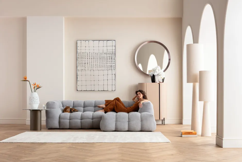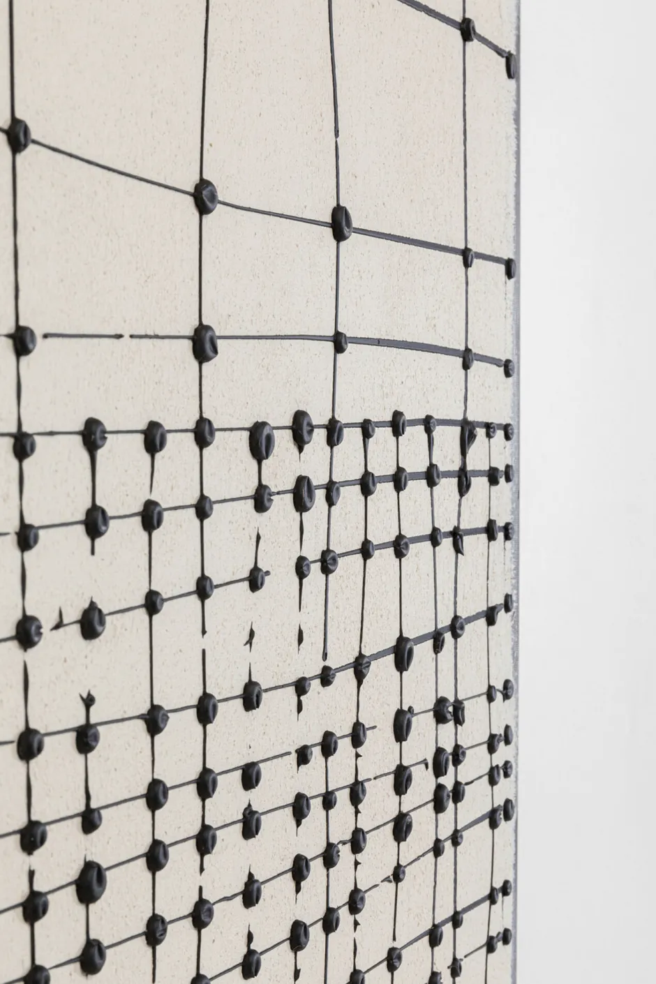 - Die abstrakten Details und Applikationen in Schwarz setzen auf dem beigen Hintergrund einzigartige Kontraste