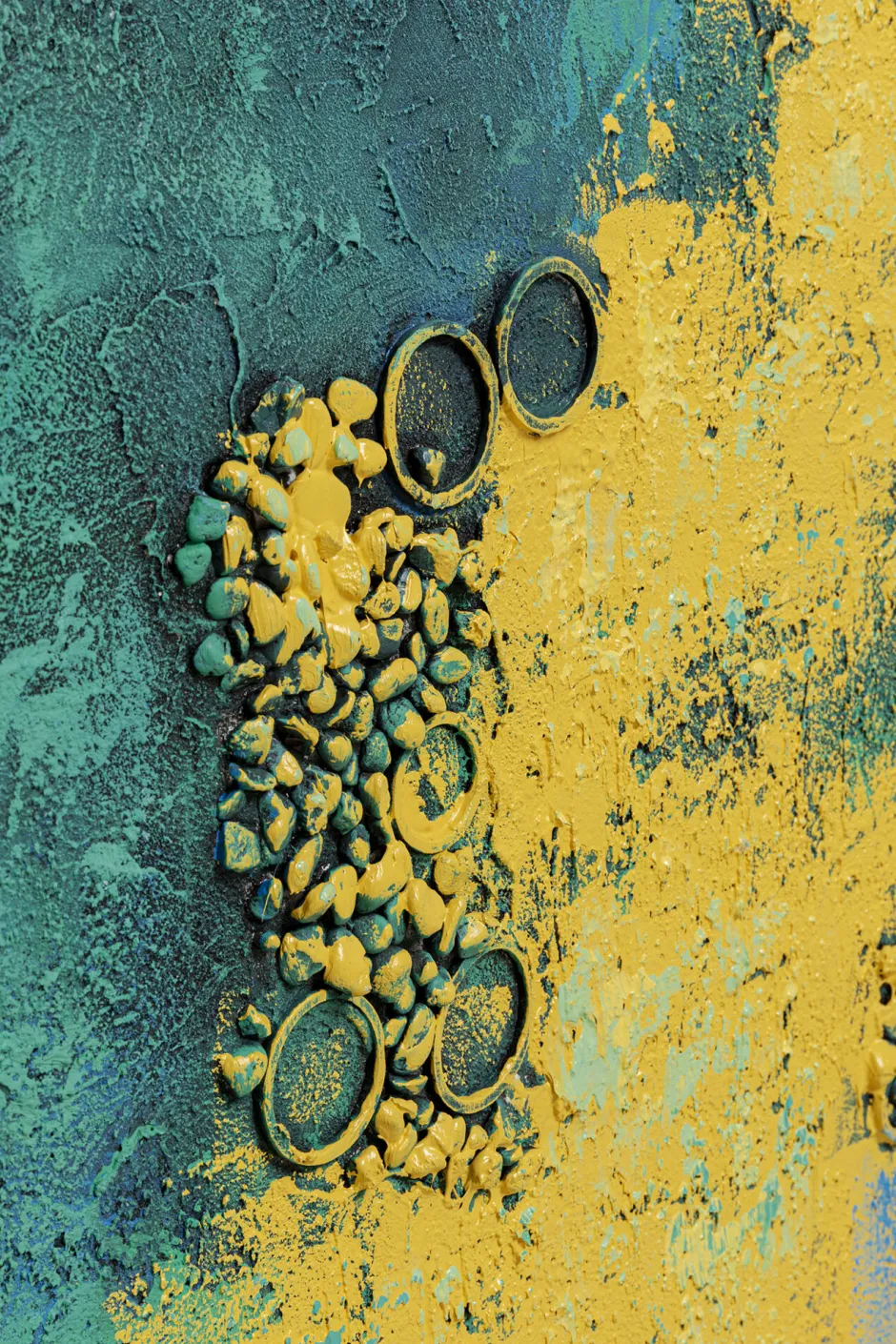 - Von Hand gemaltes Leinwandbild in Blau, Gelb und Grün-Schattierungen, 215.2 x 125.5 x 4.7 Zentimeter (H/B/T)