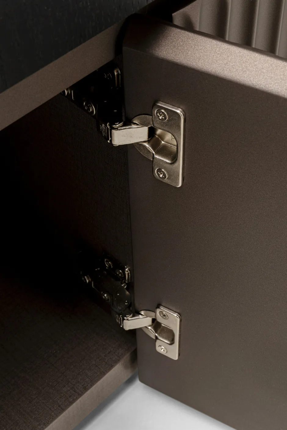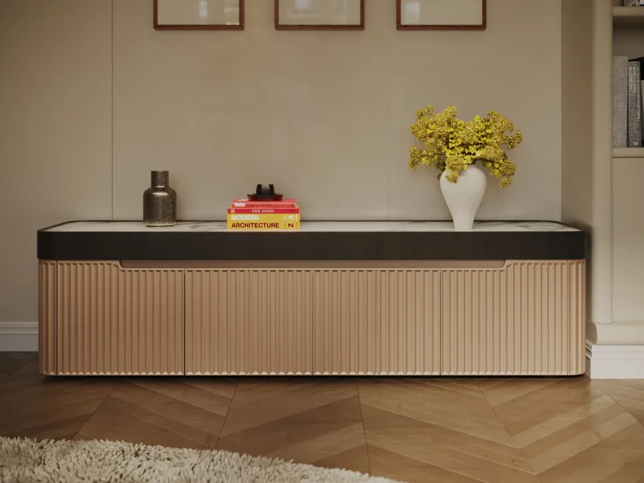 - Grifflose Türen und die klarlinige strukturierte Front verleihen dem niedrigen Sideboard seinen Designfaktor
