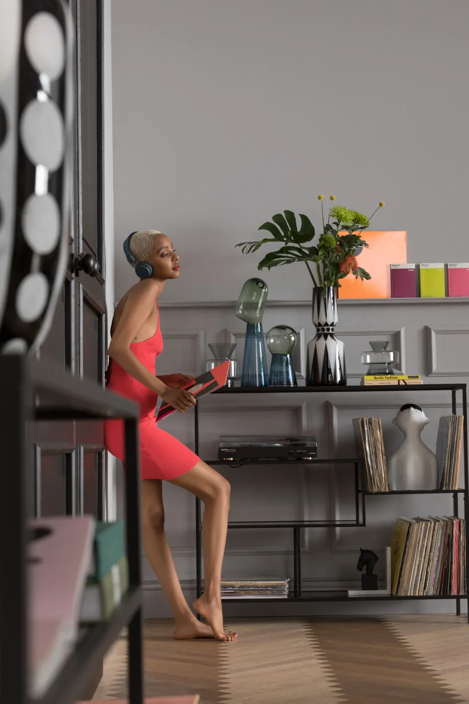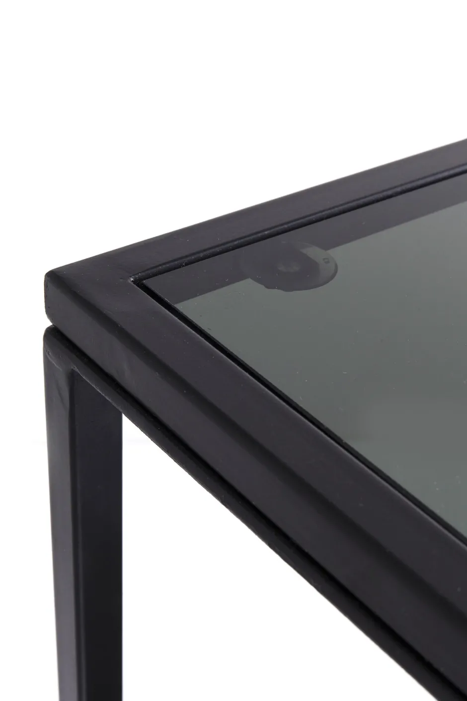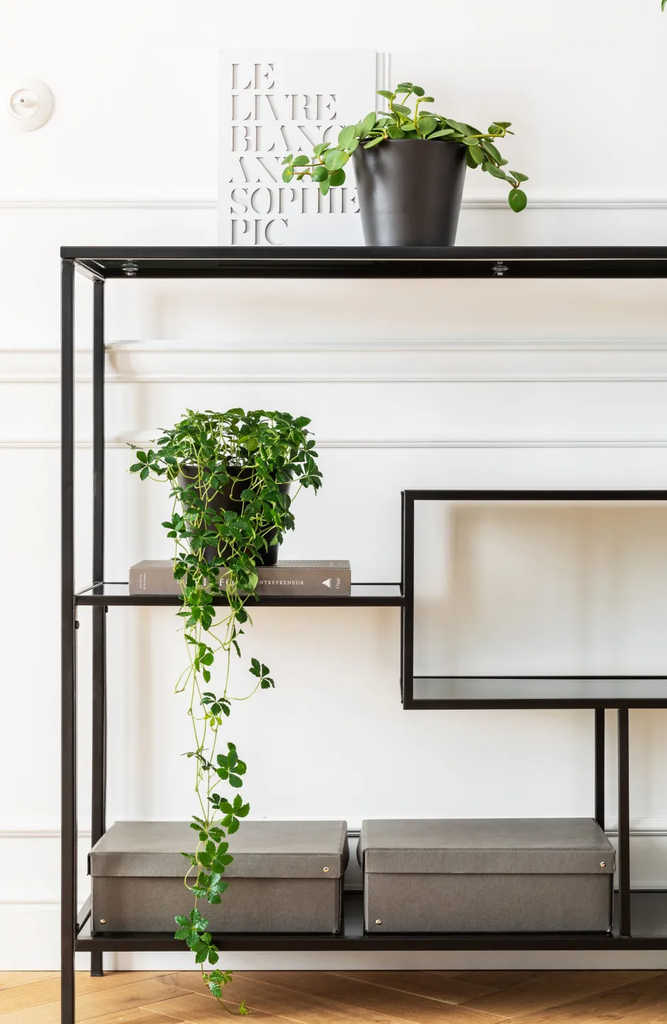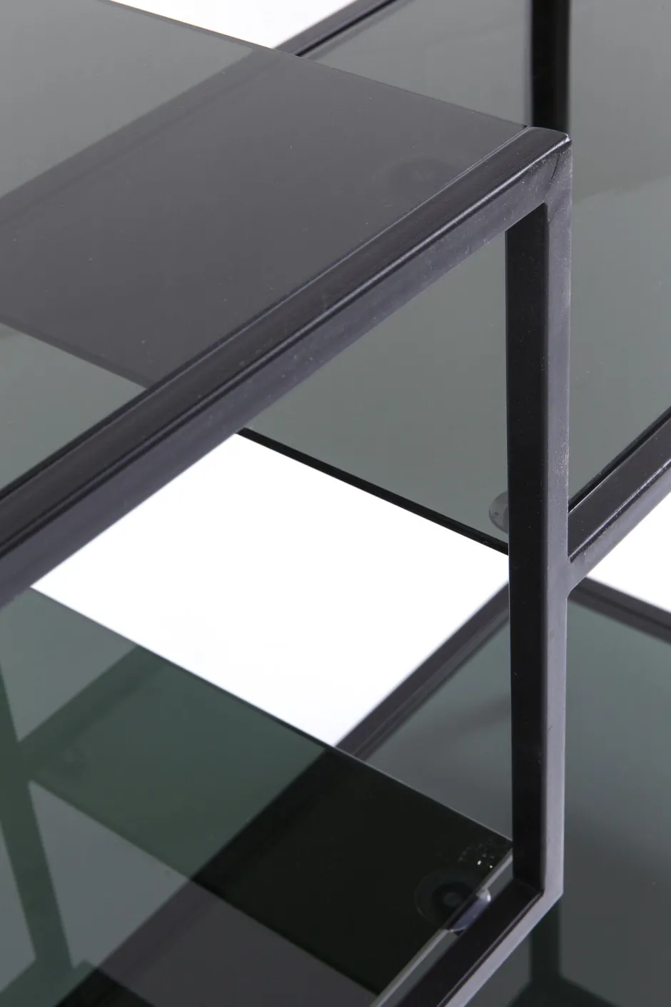 - Halbhohes schwarzes Stahlregal mit anthrazitfarbenen Böden aus Glas – die lässige Alternative zu Sideboard und Konsole