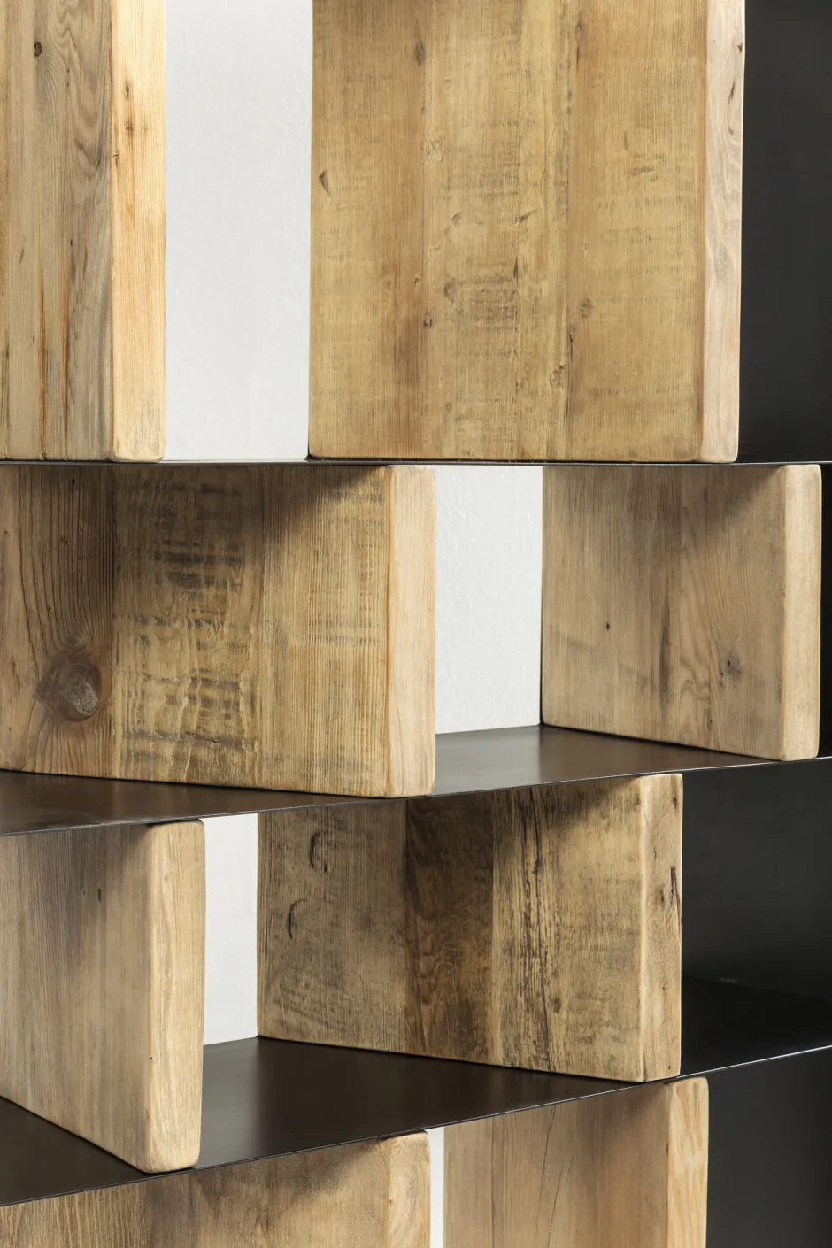 - Hohes Standregal mit einem Korpus und sechs Böden aus schwarz lackiertem Stahl und Elementen aus Kiefern-Massivholz
