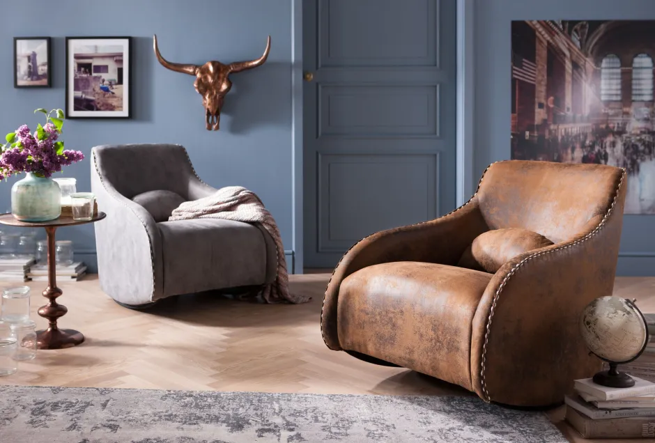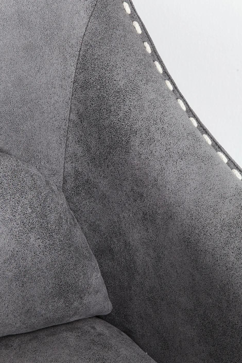 - Sehr bequemer Schaukelsessel mit grauem Bezug in Vintage Optik und mit lässigen weißen Ziernähten