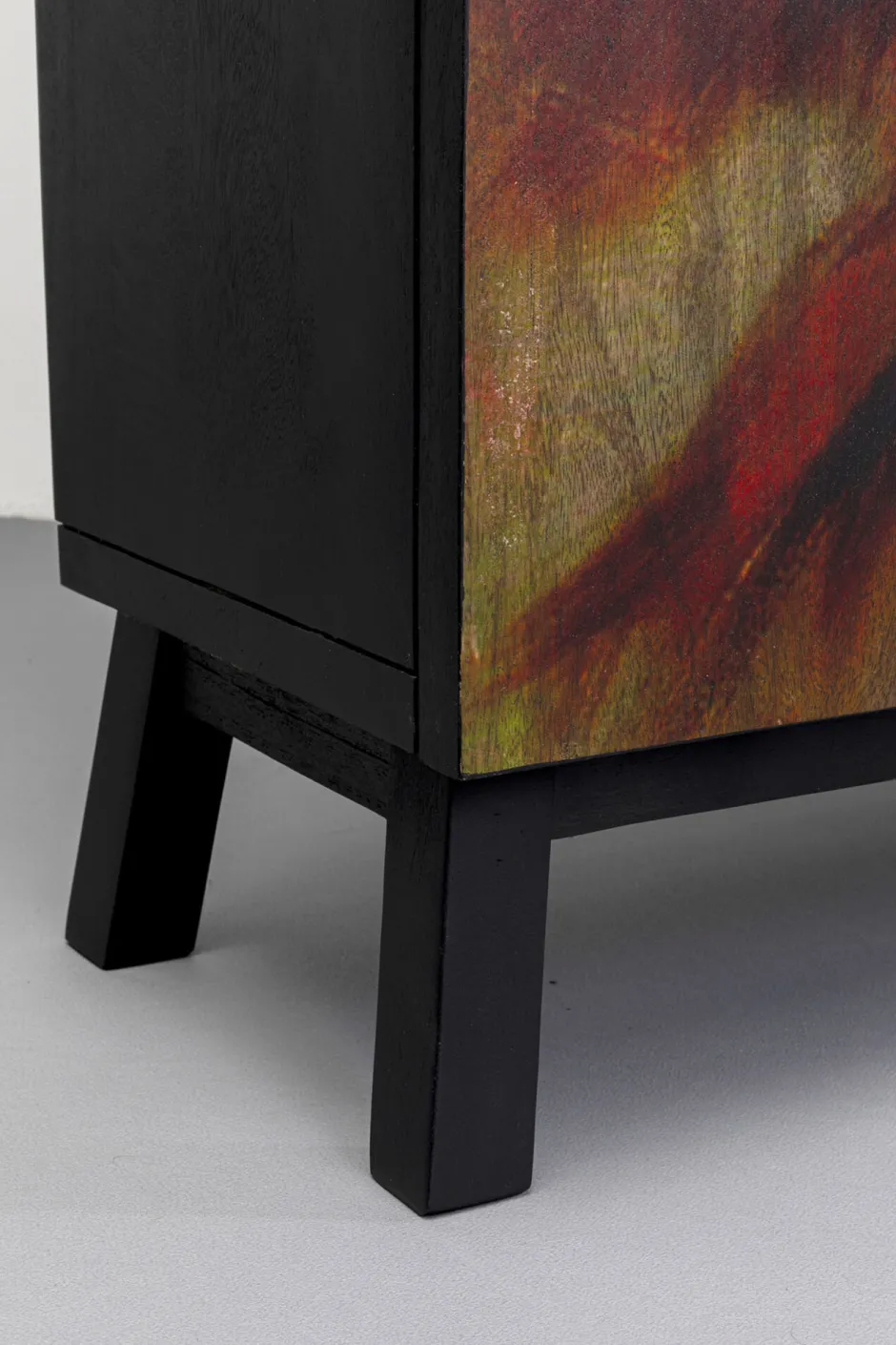 - Rechteckiger, kleiner Schrank mit schwarzem Korpus aus Mangoholz und einer Front mit Pflanzen- und Blumenmotiven