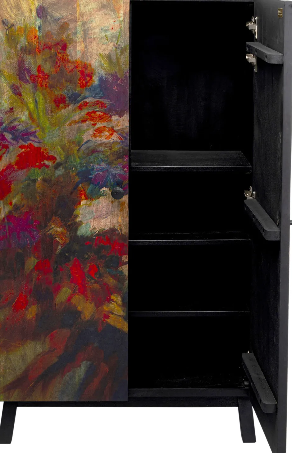 - Florale Motive und fantasievolle Pflanzenwelten verleihen dem Holzschrank eine poetische, fast träumerische Note