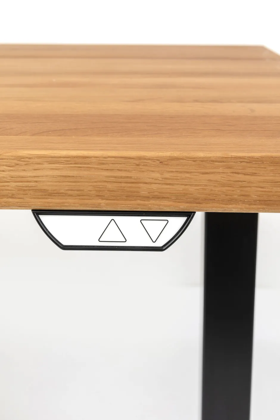 - Rechteckiger, elektrisch höhenverstellbarer Schreibtisch mit handgefertigter 3 cm starker Eichenholz-Platte und lackierten Stahl-Kufen in Schwarz