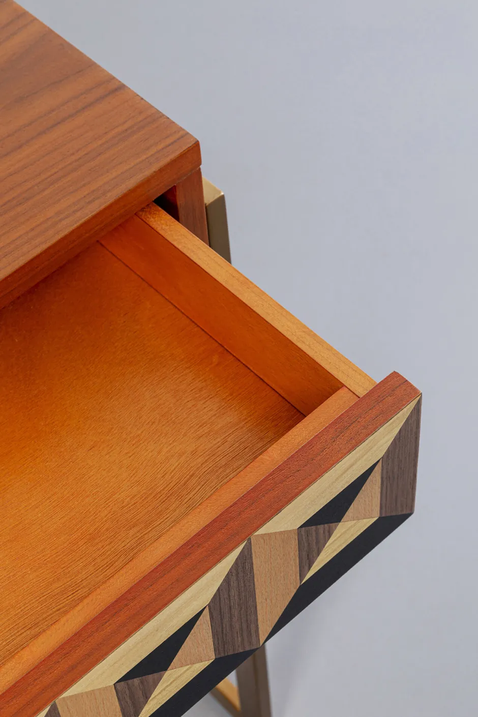 - Walnussholz-Furnier schmückt den Korpus und die Front der Schreib-Konsole