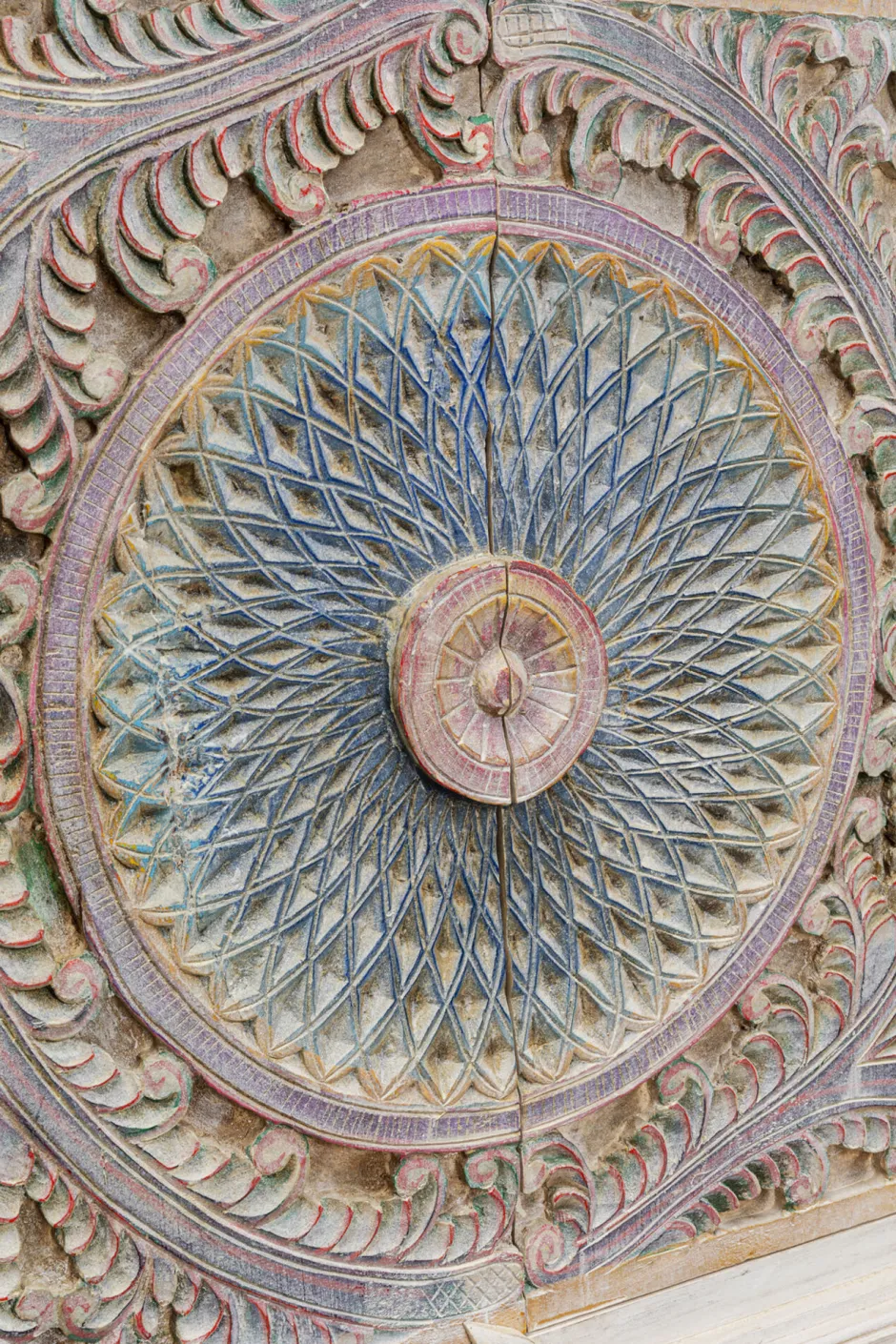 - Aufwändig geschnitzte Fronten in Pastellfarben wie Blau, Rosa und Lila