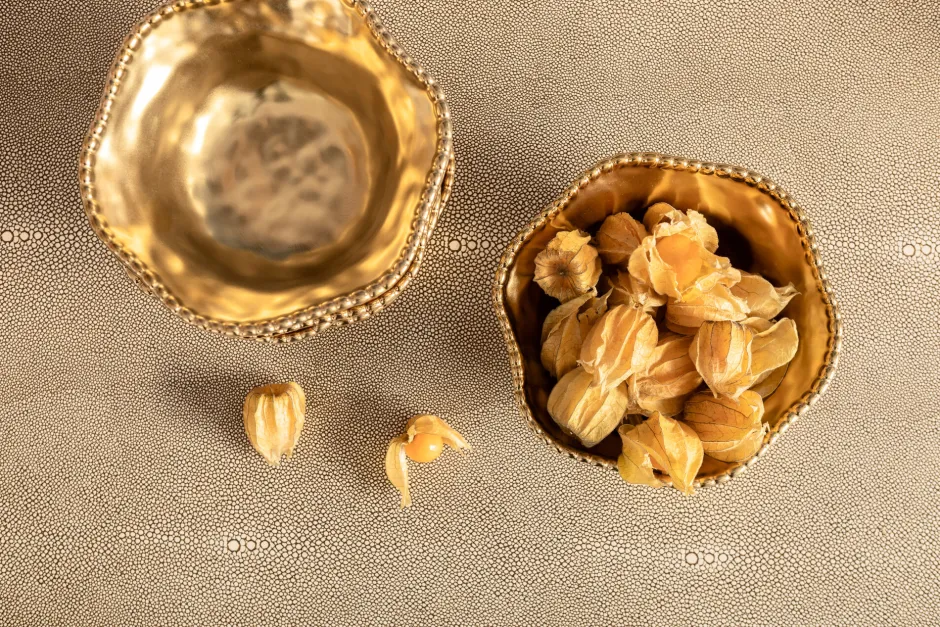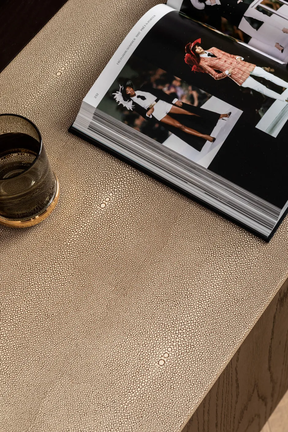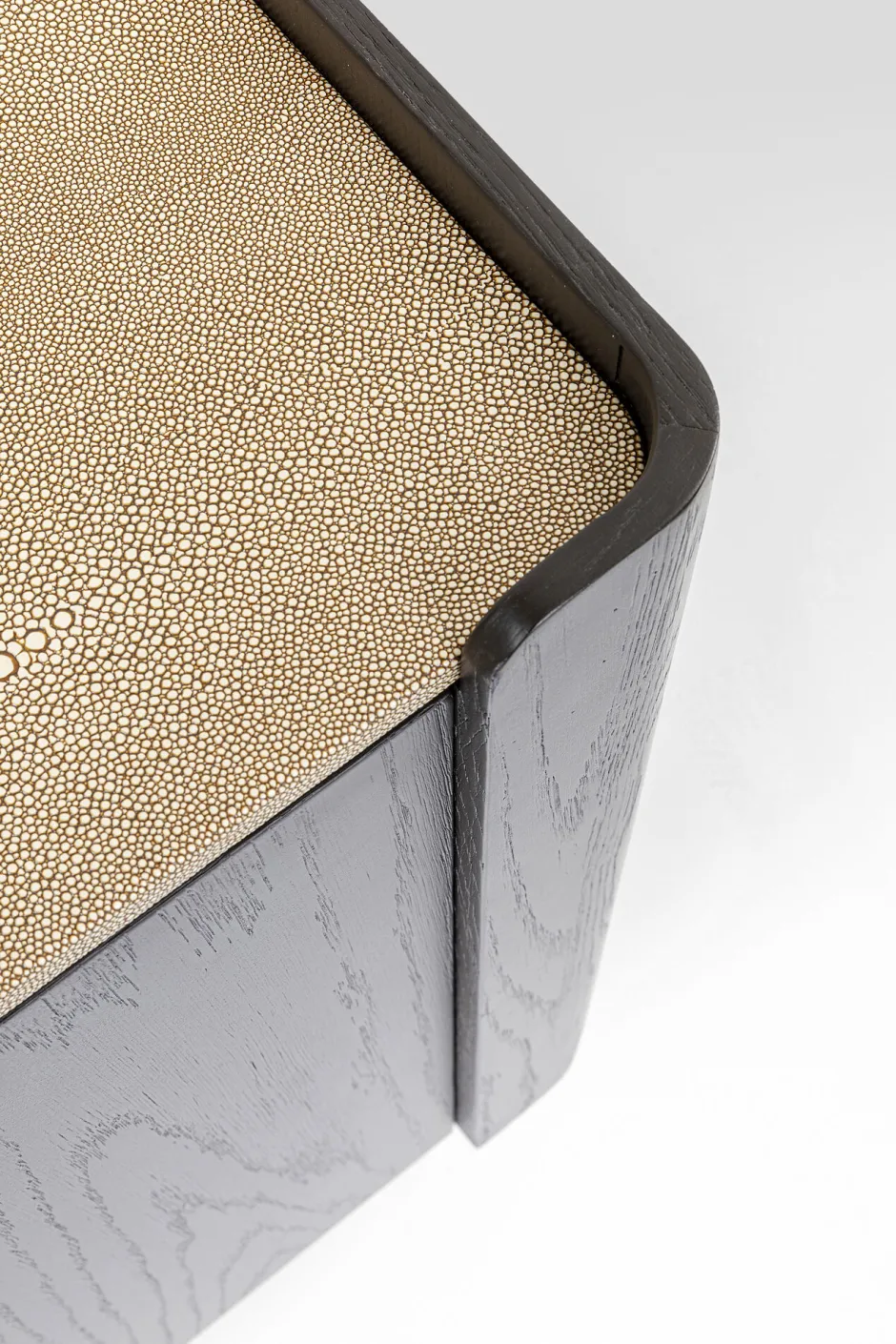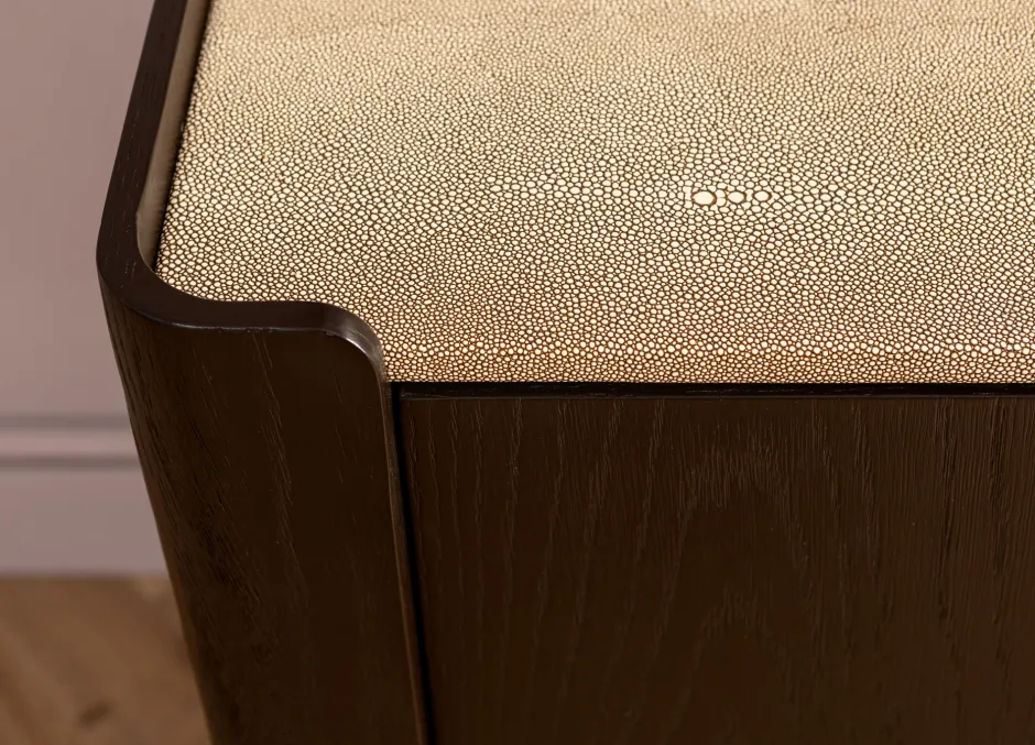 - Charaktervoll: die Verbindung von dunklem, schwarz-braunem Eichenholz-Furnier mit cremefarbenen Bezügen in feiner Rochenhaut-Optik