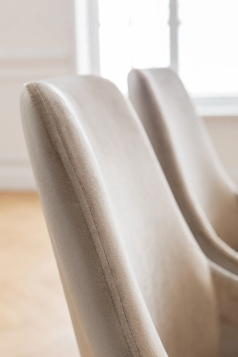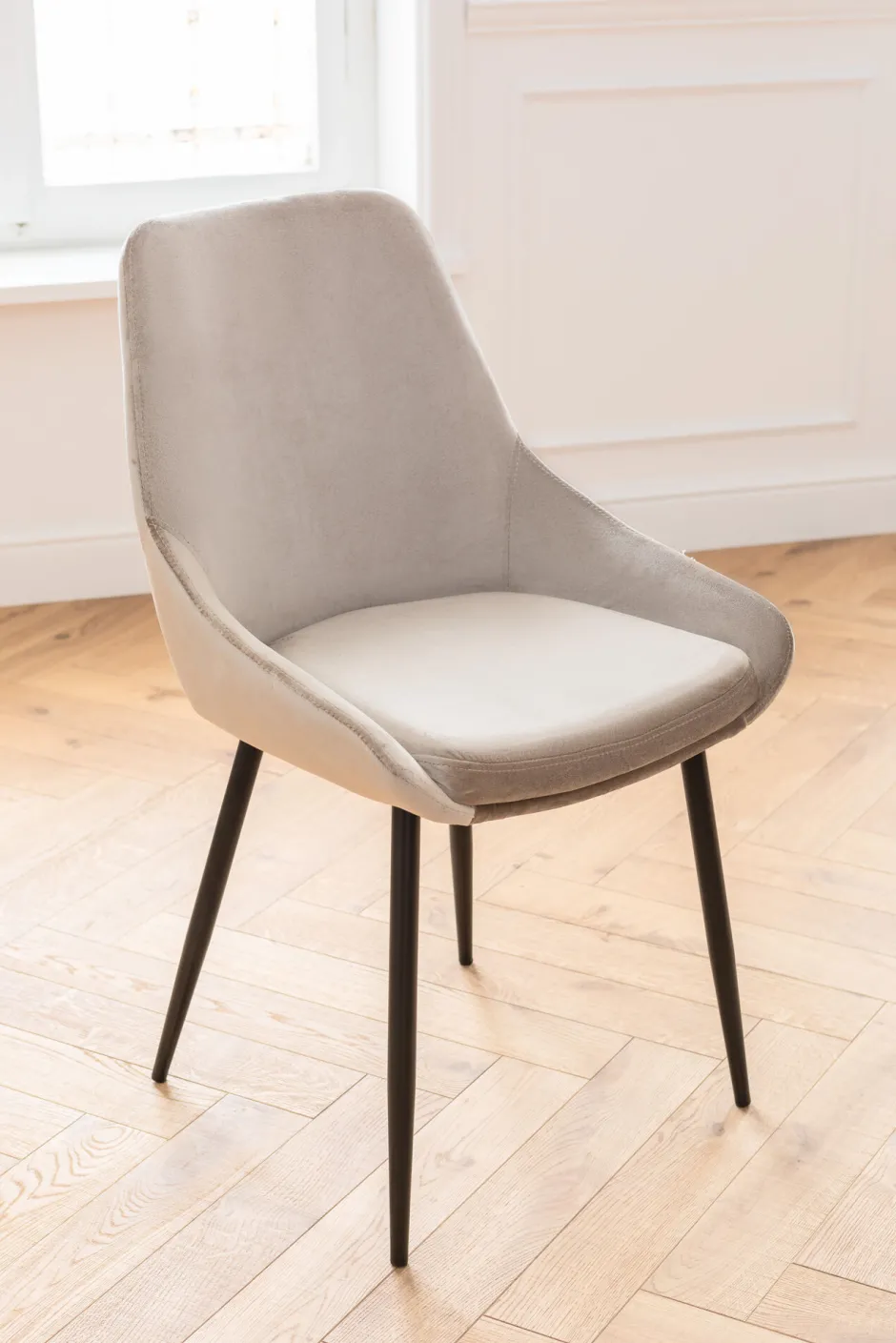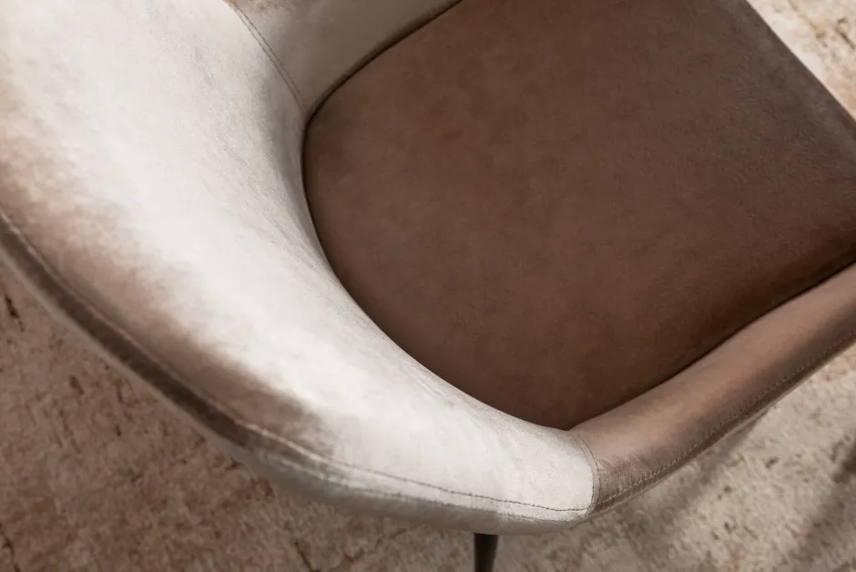 - Gepolsteter Stuhl aus beigem, schimmerndem Samt und mit schwarzen Stahlbeinen