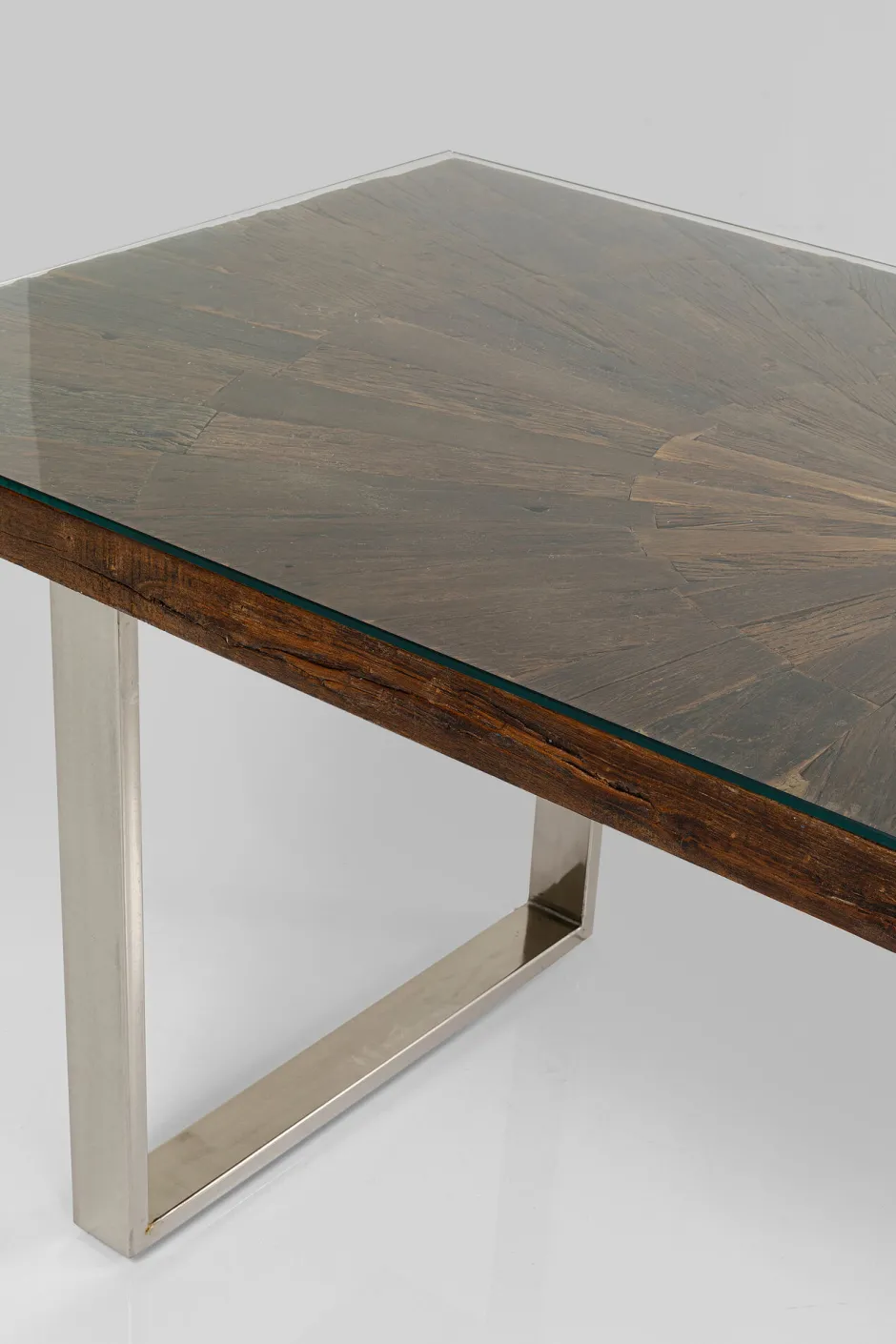 - Rechteckiger, dunkler Esstisch aus recyceltem Mango- und Akazienholz mit Glasplatte und verchromten Kufen