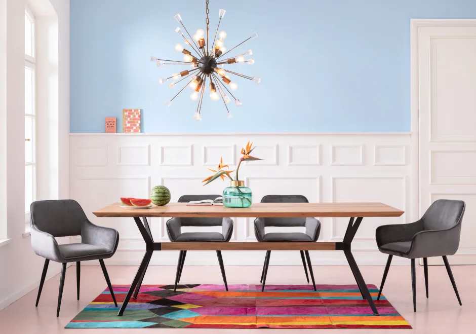 - Das Design des Gestells sorgt bei diesem großen Tisch für optische Leichtigkeit – und Beinfreiheit
