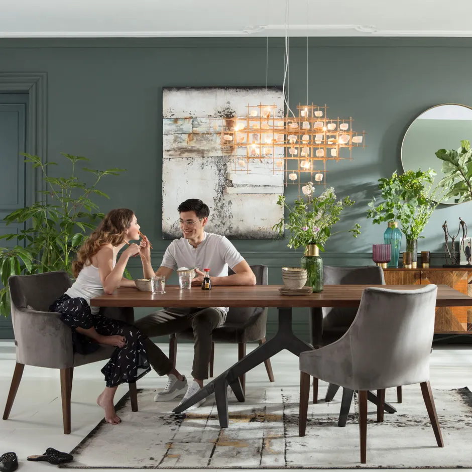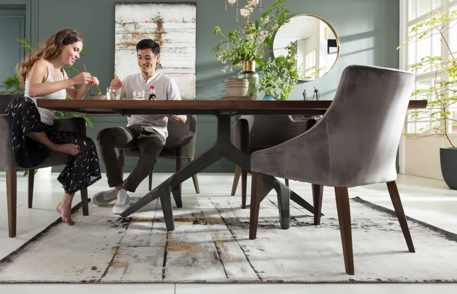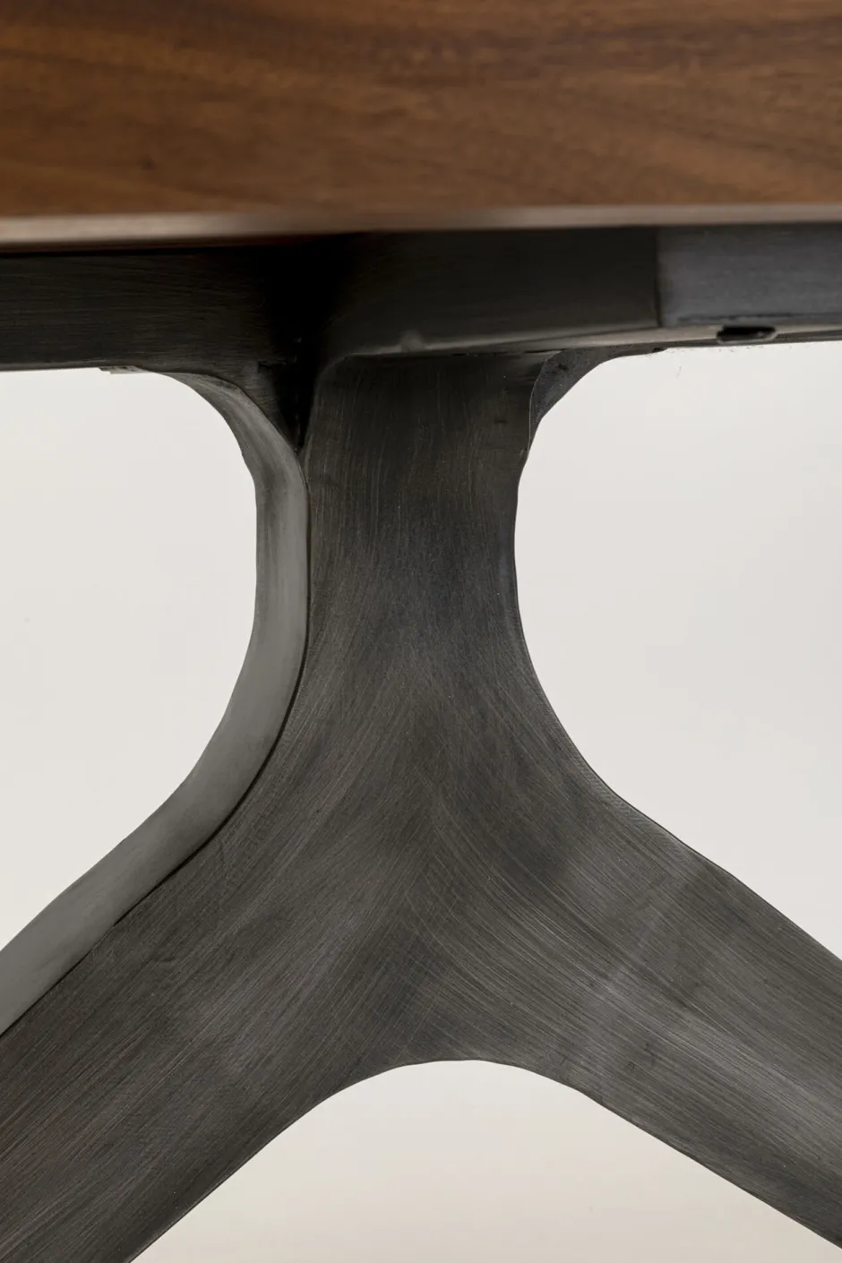 - Die Material-Kombination von sinnlichem Holz und dunklem Stahl macht diesen Esstisch zum Klassiker