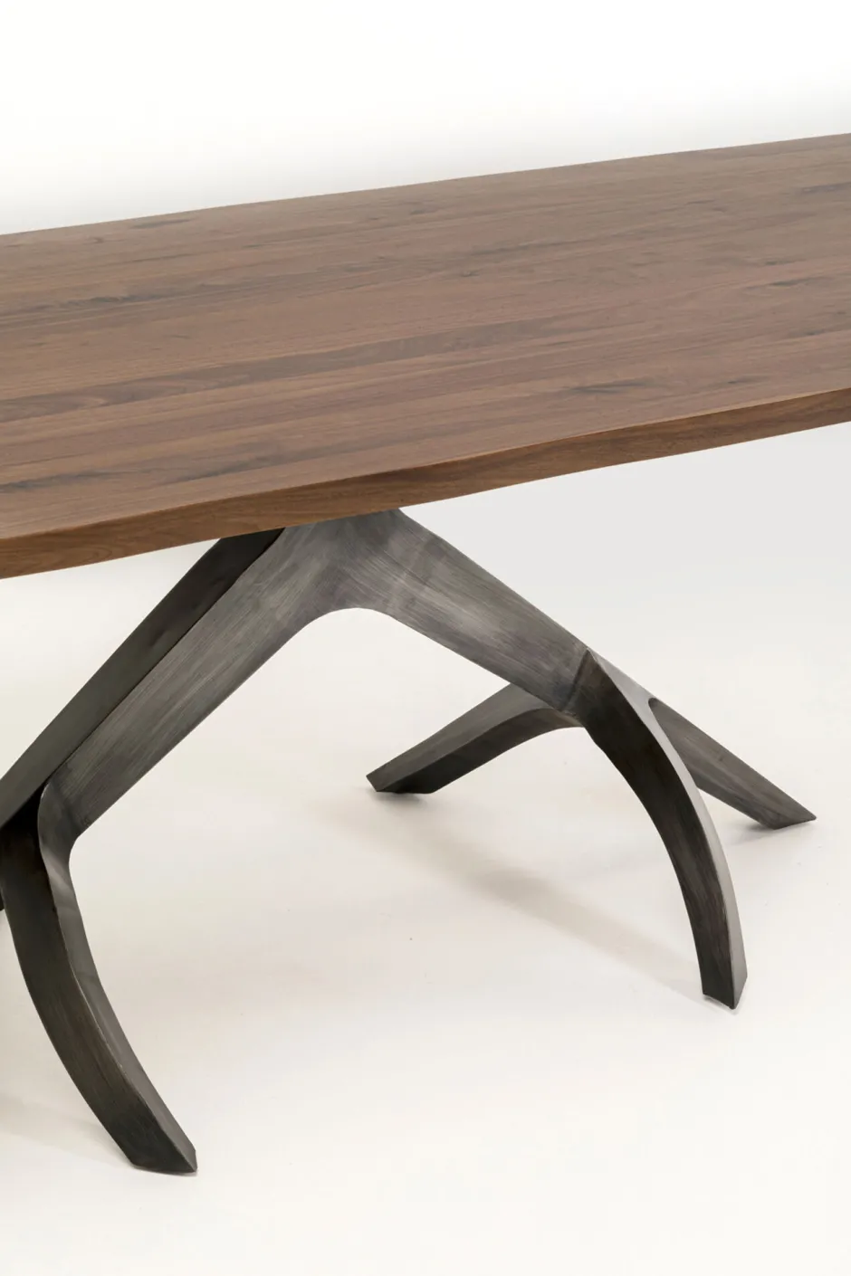 - Rechteckiger Esstisch mit einer massiven Platte aus lackiertem Nussbaum Holz und einem kunstvollen Tischgestell aus Stahl