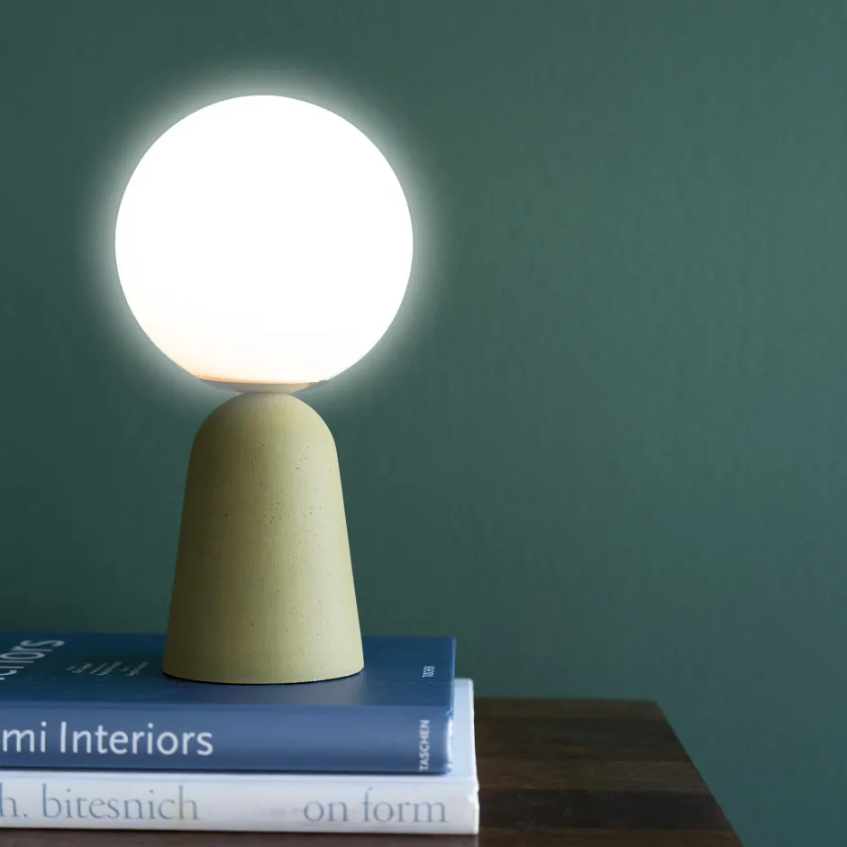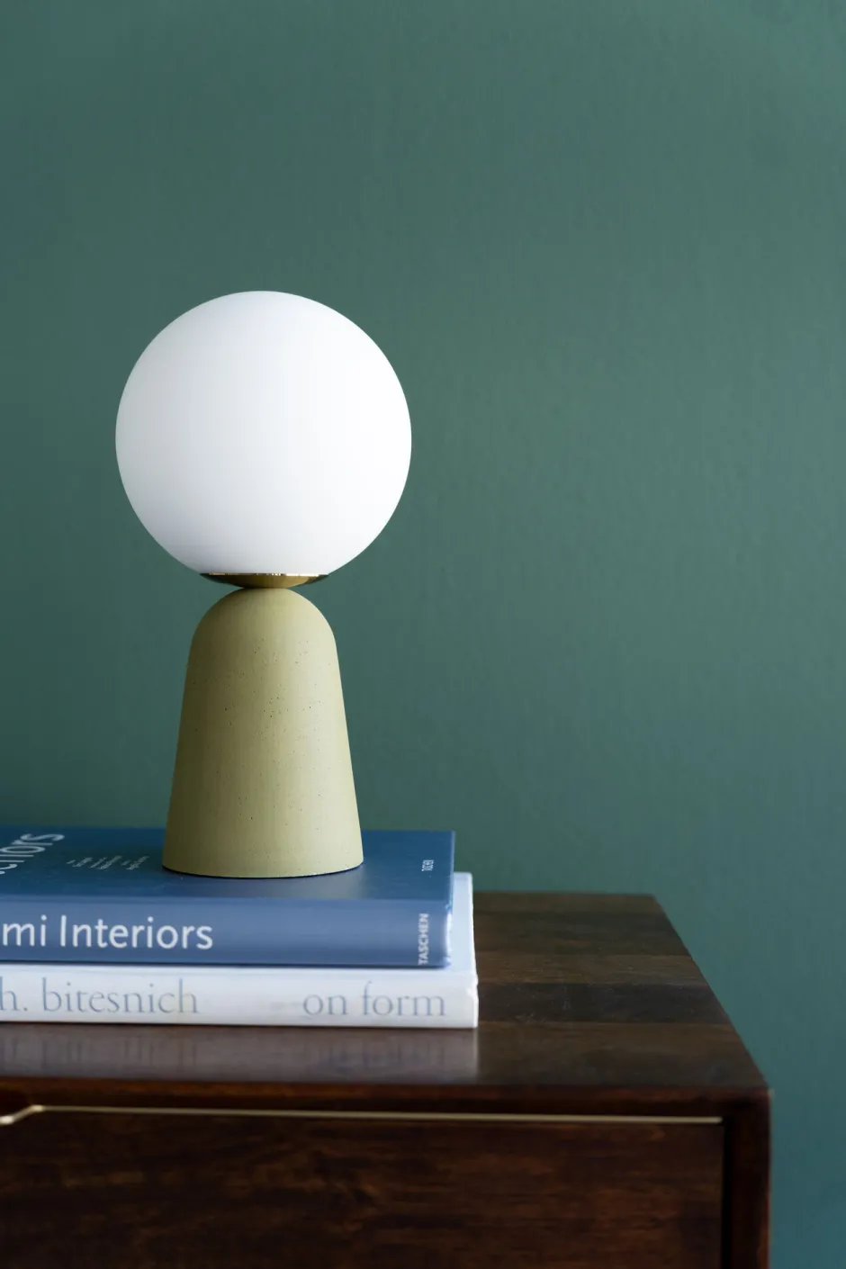 - Kleine Kugelleuchte aus Glas auf Betonsockel, 31 x 16 x 16 Zentimeter (H/B/T)
