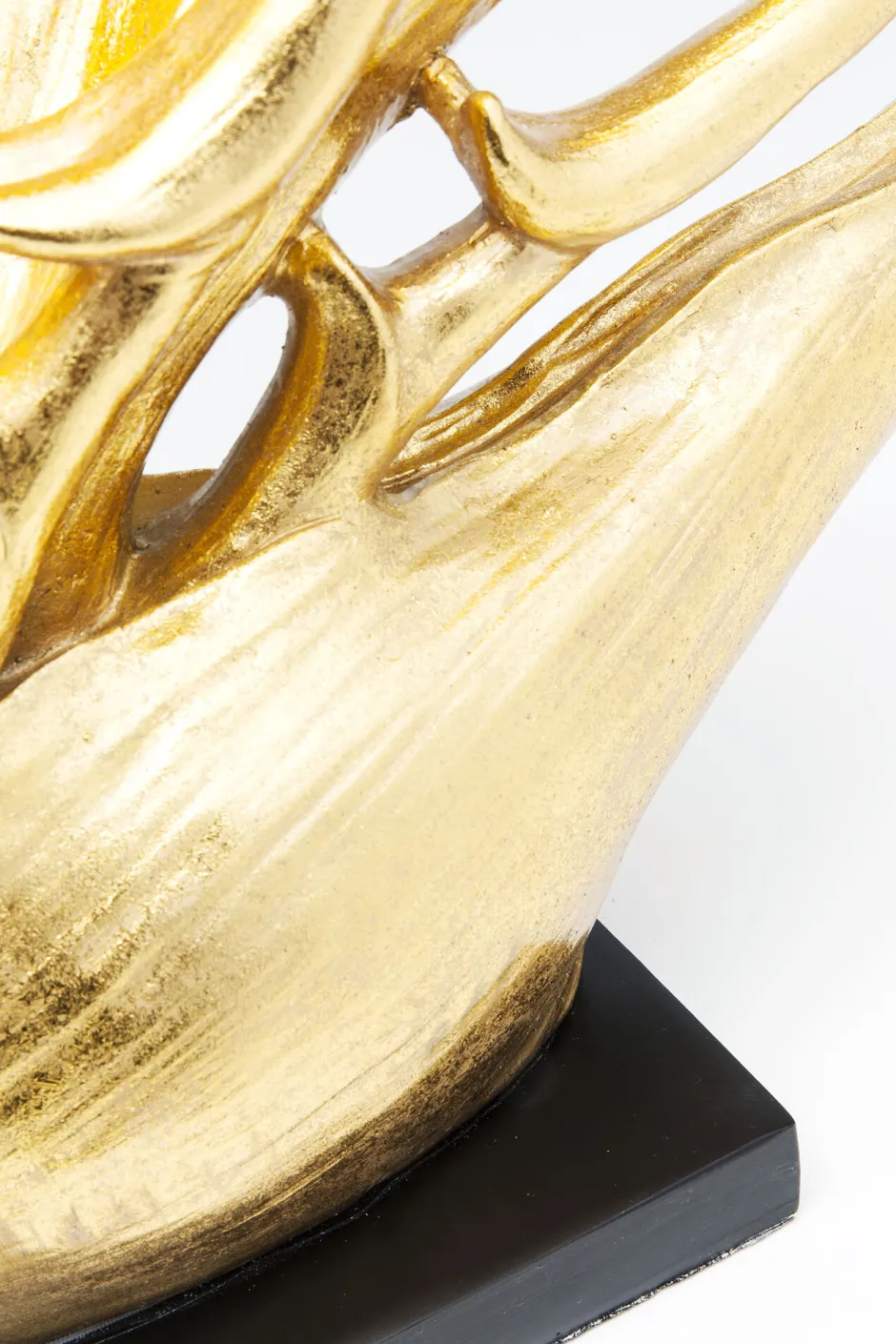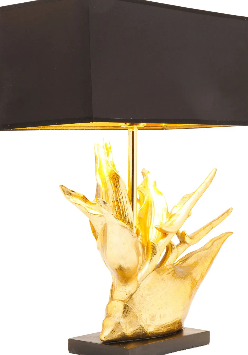 - Eine Tischleuchte in Gold und Schwarz, die mit dem aufwändig gearbeiteten Fuß wie ein Kunstobjekt wirkt