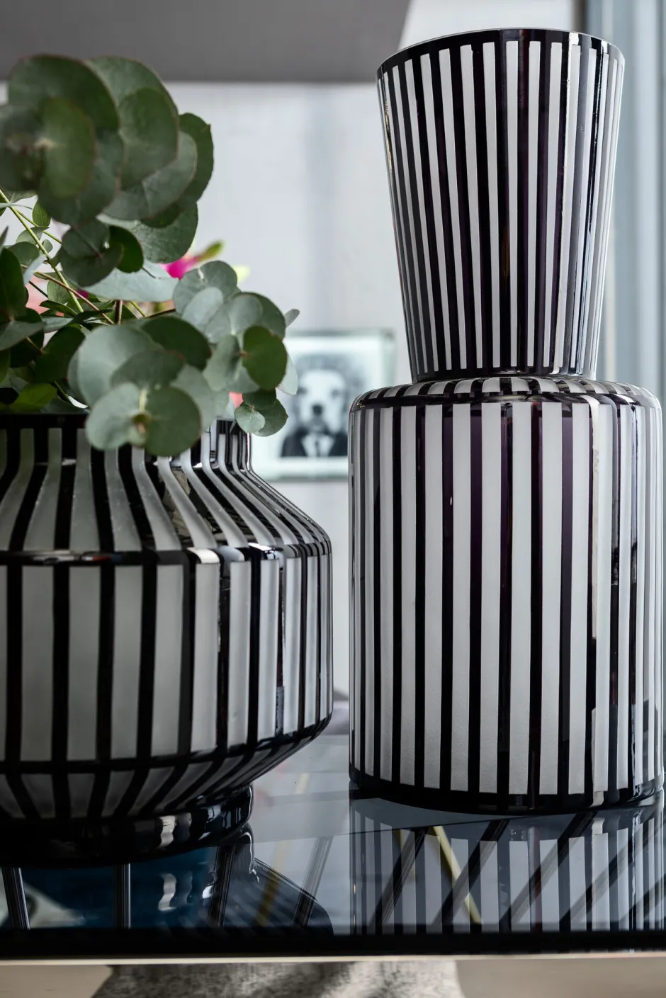 - Edle Blumenvase aus satiniertem Glas in Hellgrau mit glänzenden schwarzen Streifen
