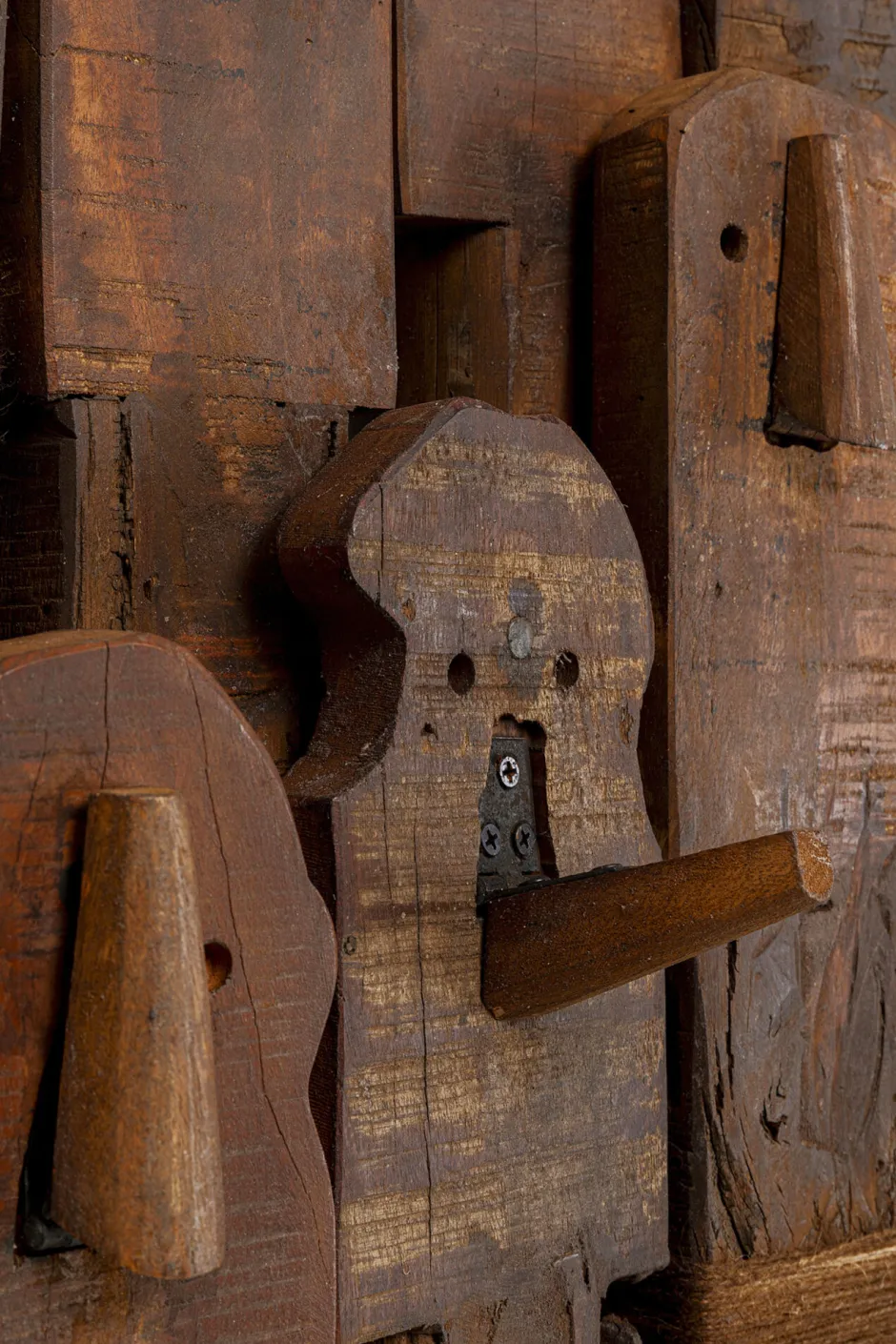 - Diese große Garderobe begeistert mit abstrakten Gesichtsmotiven und rustikaler Holzoptik