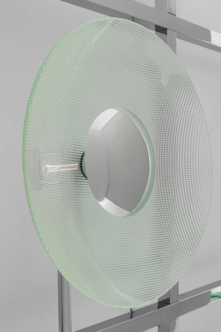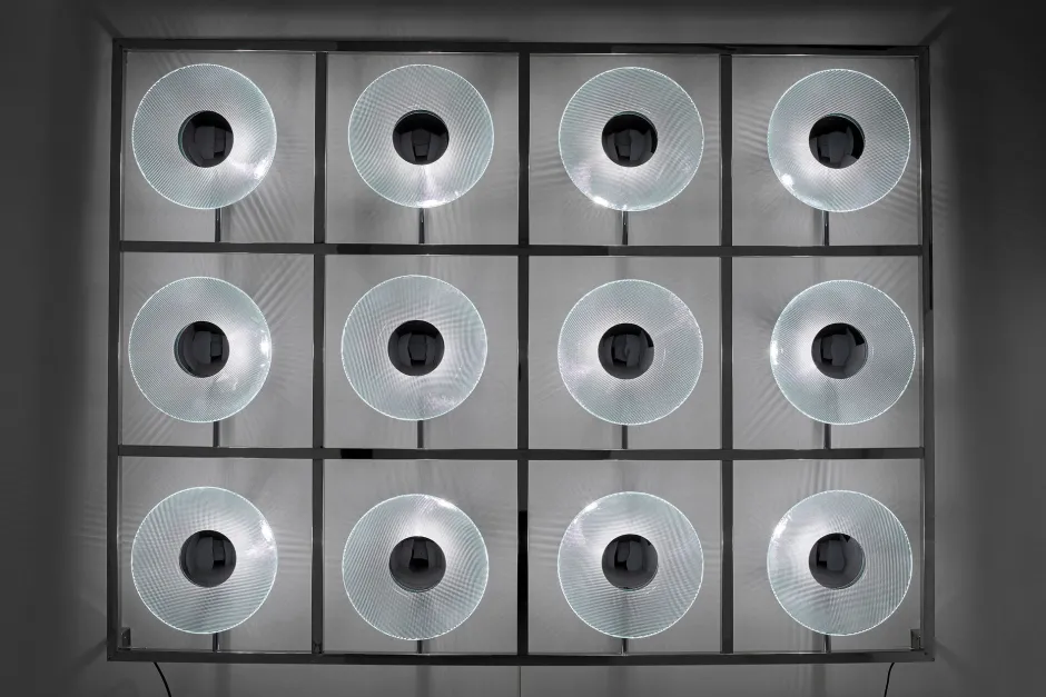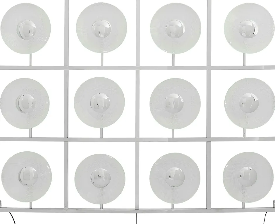 - Großes Leuchtobjekt für die Hängung an der Wand mit glänzend verchromtem Rahmen aus Edelstahl und 12 Leuchtenschirmen