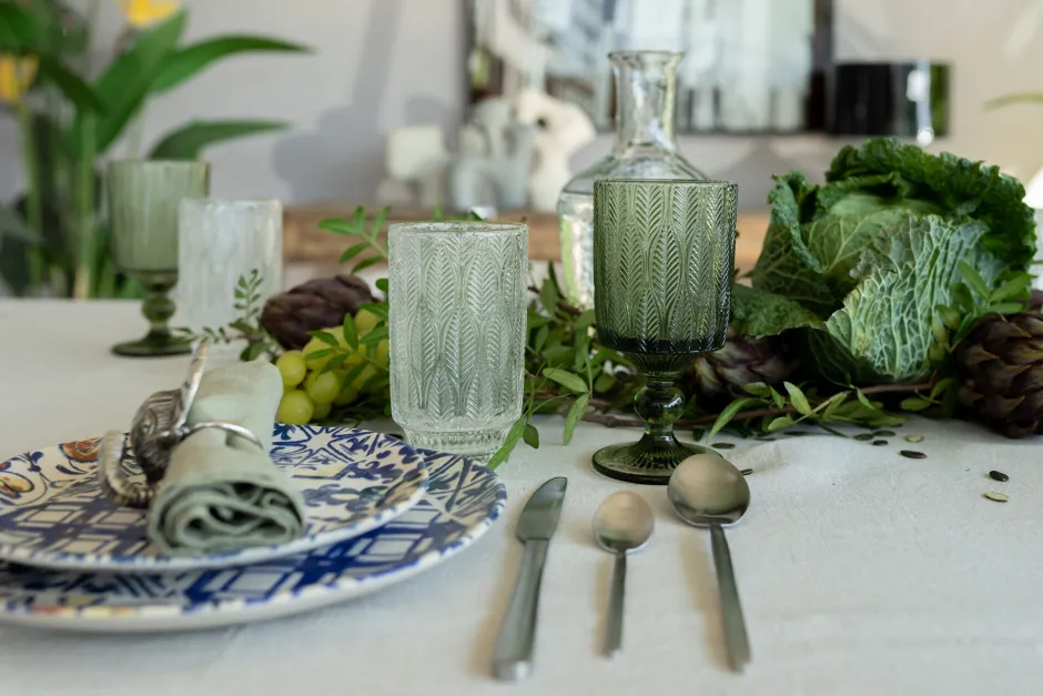 - Das Glas fasziniert durch die klassische Form und seine leicht transparente Färbung in natürlichem Grün
